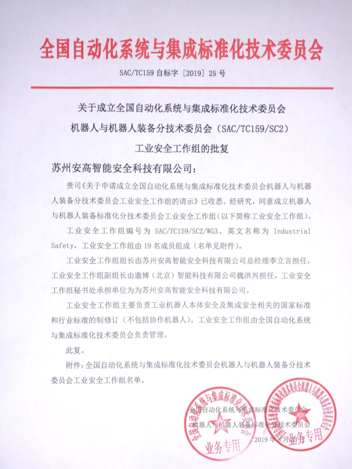 立宏安高一直致力于工業(yè)安全標(biāo)準(zhǔn)的工作,直接對口國際標(biāo)準(zhǔn)ISO/TC 299-WG3機(jī)器積人安全工作組,積極投入到國家標(biāo)準(zhǔn)GB,國際標(biāo)準(zhǔn)ISO的各項(xiàng)安全工作標(biāo)準(zhǔn)中,2019年經(jīng)國標(biāo)委下屬全國自動化系統(tǒng)與集成標(biāo)準(zhǔn)化技術(shù)委員會 機(jī)器人與機(jī)器人裝備分技術(shù)委員會的研究,同意成立機(jī)器人與機(jī)器人裝備標(biāo)準(zhǔn)化分技術(shù)委員會工業(yè)安全工作組(簡稱工業(yè)安全工作組)是國內(nèi)唯一一家C類行業(yè)機(jī)器人的安全獨(dú)立工作組,本工作組直接對口國際ISO/TC 299-WG3機(jī)器人工作組。
